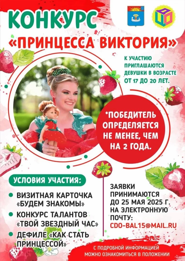 Объявляется старт городского конкурса «Принцесса Виктория 2025»! Она станет центральной фигурой Фестиваля клубники, который пройдет 14 июня.