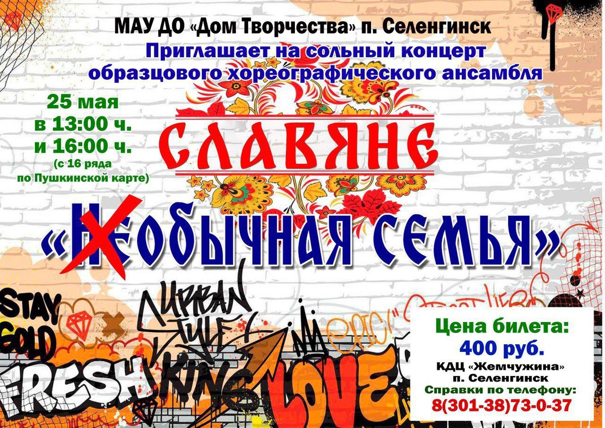 📣Пройдёт сольный концерт Образцового хореографического ансамбля "Славяне" 🎶"Необычная семья" 🗓25 мая - в КДЦ «Жемчужина» - в посёлке Селенгинск 🔹в 13-00 ч. 🔹в 16-00ч. Цена билета 400 рублей🎫 Действует Пушкинская карта vmuzey.com/event/neobychnaya-obychnaya-semya