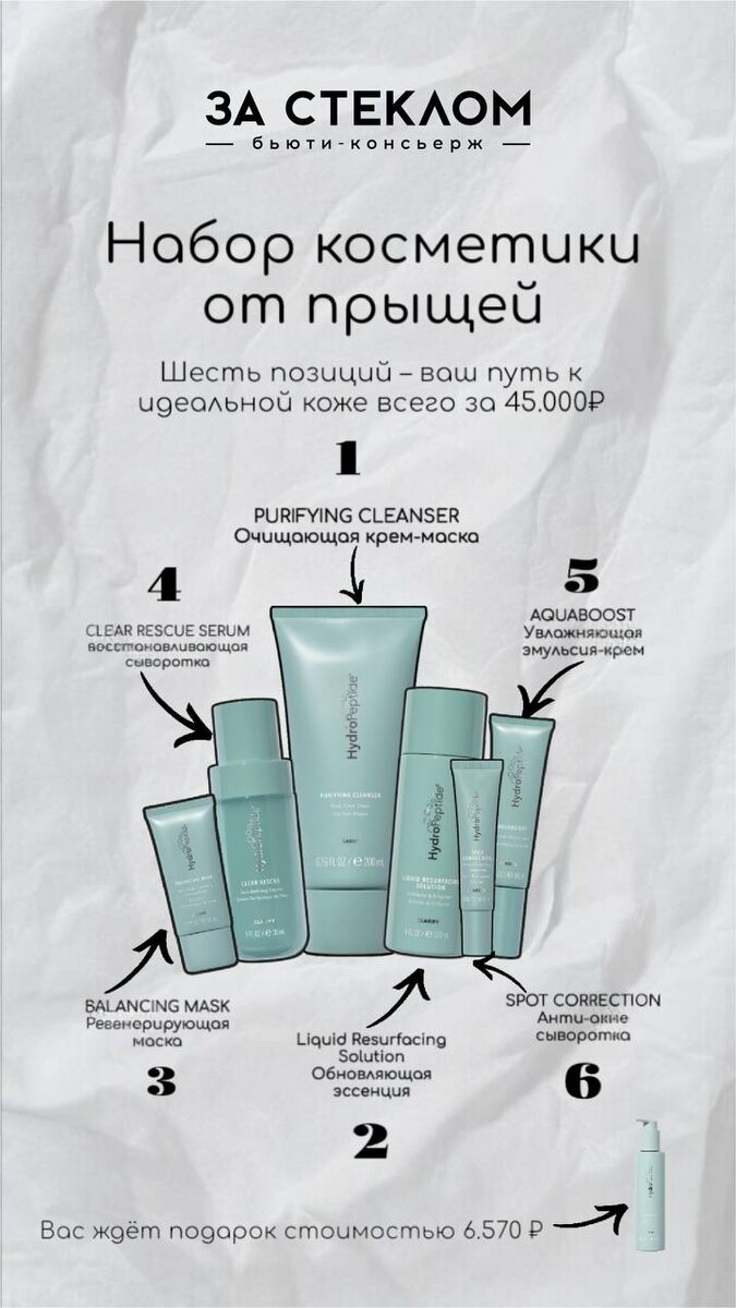 Всем привет! С вами я, Алла, beauty-консьерж салона «За Стеклом». Сегодня я расскажу, как с помощью шестишаговой системы Clarify от бренда Hydro Peptide победить воспаления, избыточную продукцию себума, неровный тон и текстуру кожи, а также предотвратить повторные высыпания. ВАЖНО! Всё средства не наносятся в область вокруг глаз. Крем-маска Purifying Cleanser – это глубокое очищение кожи с антибактериальным эффектом. В составе: антимикробные пептиды, фруктовые кислоты и растительные экстракты. Действие: борется с воспалениями, абсорбирует излишки кожного жира и сужает поры. Применение: утром и вечером — использовать как обычное умывание. Нанесите на влажную кожу, помассируйте 2–3 минуты, затем смойте тёплой водой. Эссенция Liquid Resurfacing Solution Мягкое обновление и сияние кожи без границ. В составе: 2 % салициловая кислота и пептиды. Действие: отшелушивает, сужает поры и стимулирует выработку коллагена. Применение: только вечером после очищения. Наносите лёгким тонким слоем — н