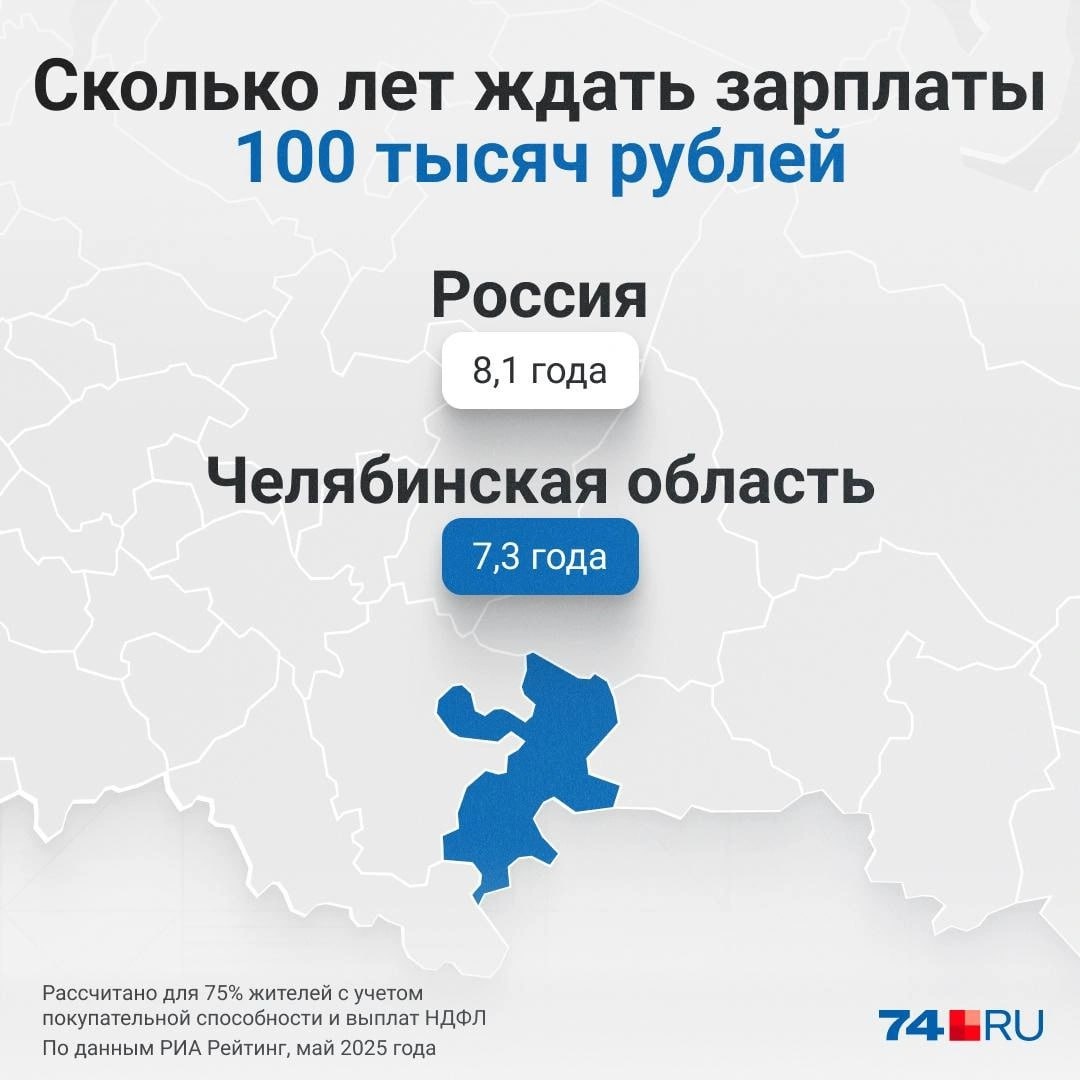 Половина жителей Челябинской области будет зарабатывать 100 тысяч рублей только к 2029 году. Для 75% работающих — ждать ещё дольше: 7,3 года К такому выводу пришли эксперты Центра экономических исследований РИА Рейтинг. 🟥Где зарплаты растут быстрее. Лидируют северные регионы: ЯНАО, Чукотка, Магаданская область, Югра и Татарстан. Там заветную сумму получат уже через 3,7–6 лет. Причина — добывающие отрасли и высокие изначальные зарплаты. Сейчас там медианная зарплата с поправкой на дороговизну — меньше 90 тысяч. 🟥Что на Южном Урале. Между тем в 2024 году средняя зарплата на Южном Урале, по данным Челябинскстата, чуть превысила 70 тысяч рублей (70 944 рубля). Скакала весь год: от 67 до 88 тысяч. При этом реальные доходы с учётом инфляции выросли лишь на 12,6%. В марте глава города Алексей Лошкин озвучил среднюю заработную плату в Челябинске 85 тысяч рублей — по оценке крупных и средних организаций, 68 тысяч рублей — в муниципальных организациях. Правда, большая часть наших читателей