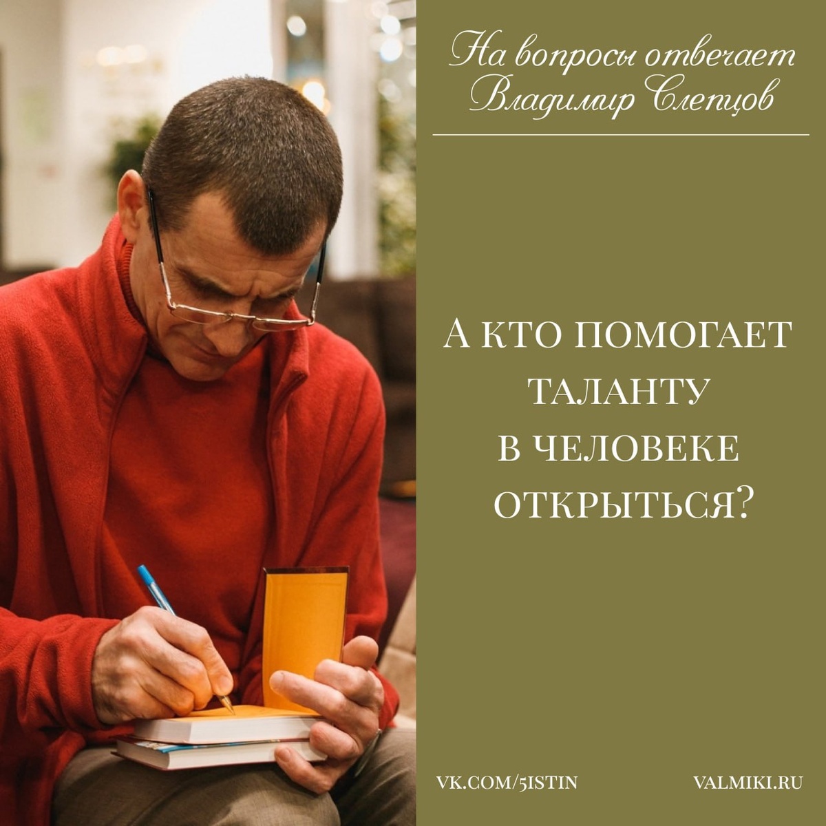💡ВОПРОС: «А кто помогает таланту в человеке открыться?» 🎤ОТВЕТ: «Учитель, общество, родители, друзья, то есть доброжелатели, все разом, как большая семья. Все как бы становятся зависимы друг от друга. Например, чтобы в человеке раскрылся талант художника, он должен общаться с художниками, с творческими людьми, он должен в общество такое выходить, где есть старшие учителя, которые могут передать ему этот вкус или принцип раскрытия таланта. Это должны быть люди бескорыстные, потому что корыстные люди захотят что-то свое человеку привить. А учитель бескорыстен, он видит природу ребенка и раскрывает ее не для себя, а для ребенка, чтобы ребенок счастливым стал. Вот это уже смирение учителя – свое не навязать». Владимир Слепцов, 🎧Лекция «Какой клад спрятан внутри каждого человека?» #отвечает_Владимир_Слепцов