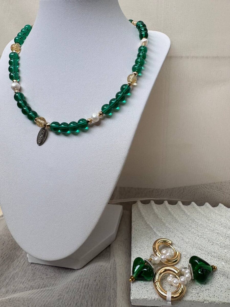 Глубокий зеленый цвет этого колье смотрится так романтично! Аккуратный дизайн и органичное сочетание фактур соединяются и создают идеальное украшение для весны. А смелые серьги прекрасно дополнят минималистичное колье.💚 ✨Нажмите для заказа ✉️ Нажмите чтобы задать вопрос
