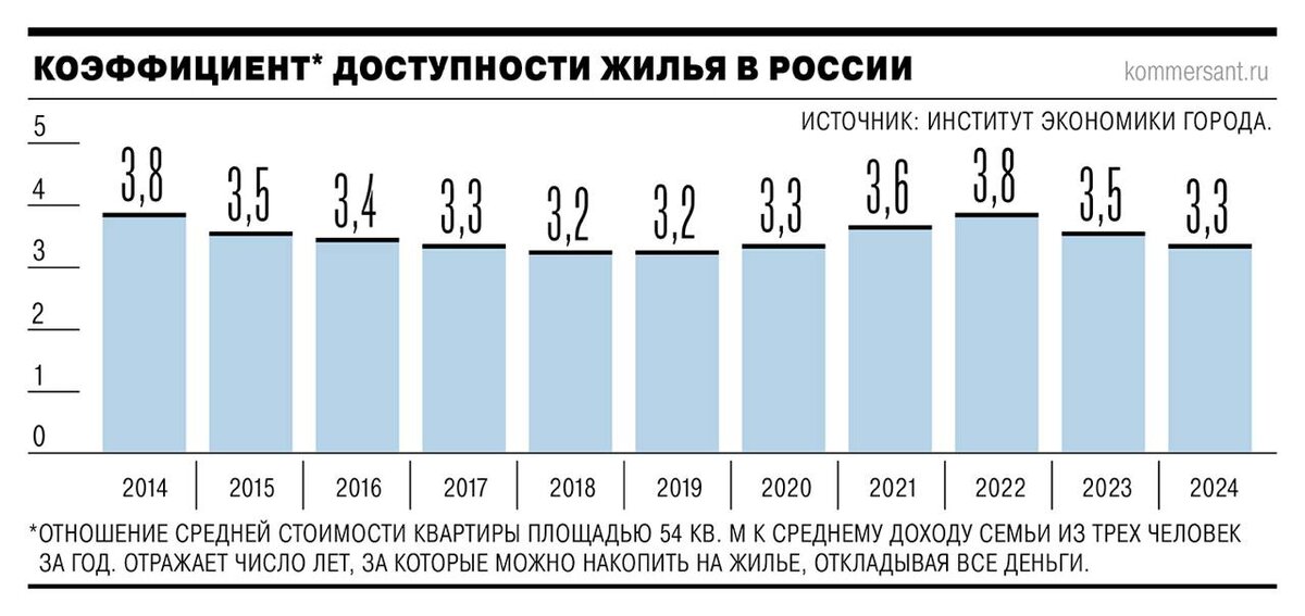 Цены на новостройки растут медленнее инфляции, но доступнее не становятся • В апреле 2025 года жильё подорожало на 9% год к году — меньше, чем официальная инфляция (10,2%). Доходы при этом выросли на 8,4%, и формально жильё стало доступнее — на квартиру в 54 м² теперь нужно копить ~3 года и 3 месяца.