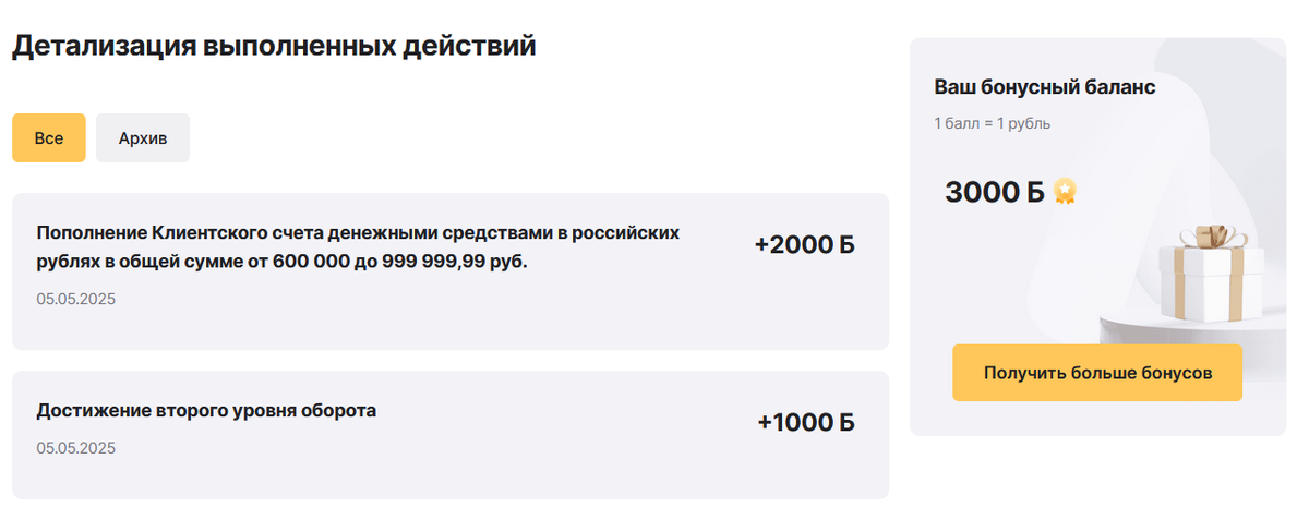 В этот раз я просто купил их фонд денежного рынка FMMM - комиссия брокера на покупку и продажу отсутствуют. За пополнение счета и оборот мне уже начислили 3000 бонусов, которые в конце квартала выплатят рублями.