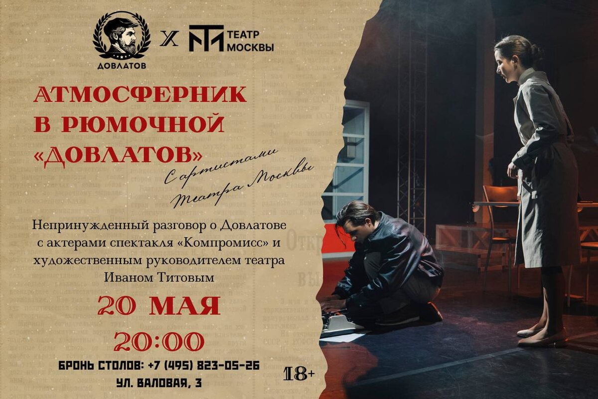 Если вечер вторника, то только такой! Уже сегодня в 20:00 в рюмочной «Довлатов» состоится атмосферный творческий вечер и живое общение с режиссёром и артистами спектакля «Компромисс» Театра Москвы (наших больших любимок, как вы наверняка помните). Вам представится редкая возможность заглянуть за кулисы постановки, поговорить с режиссером спектакля Иваном Титовым и актерами о творческом процессе, вдохновении, компромиссах и, конечно, о самом Довлатове — ироничном, честном, узнаваемом. Что в программе? 😈 Живое общение с артистами и создателями спектакля 😈 Показ трейлера спектакля 😈 Песни под гитару от Павла Сошнина 😈 Уютная довлатовская атмосфера с настойками Приходите, даже если вам пока не удалось посмотреть спектакль — в любом случае будет классно! Когда: 20 мая в 20:00 Где: Рюмочная «Довлатов» на Павелецкой. ул. Валовая, д. 3 Бронь столов по телефону: +7(495)823-05-26. Вход свободный!