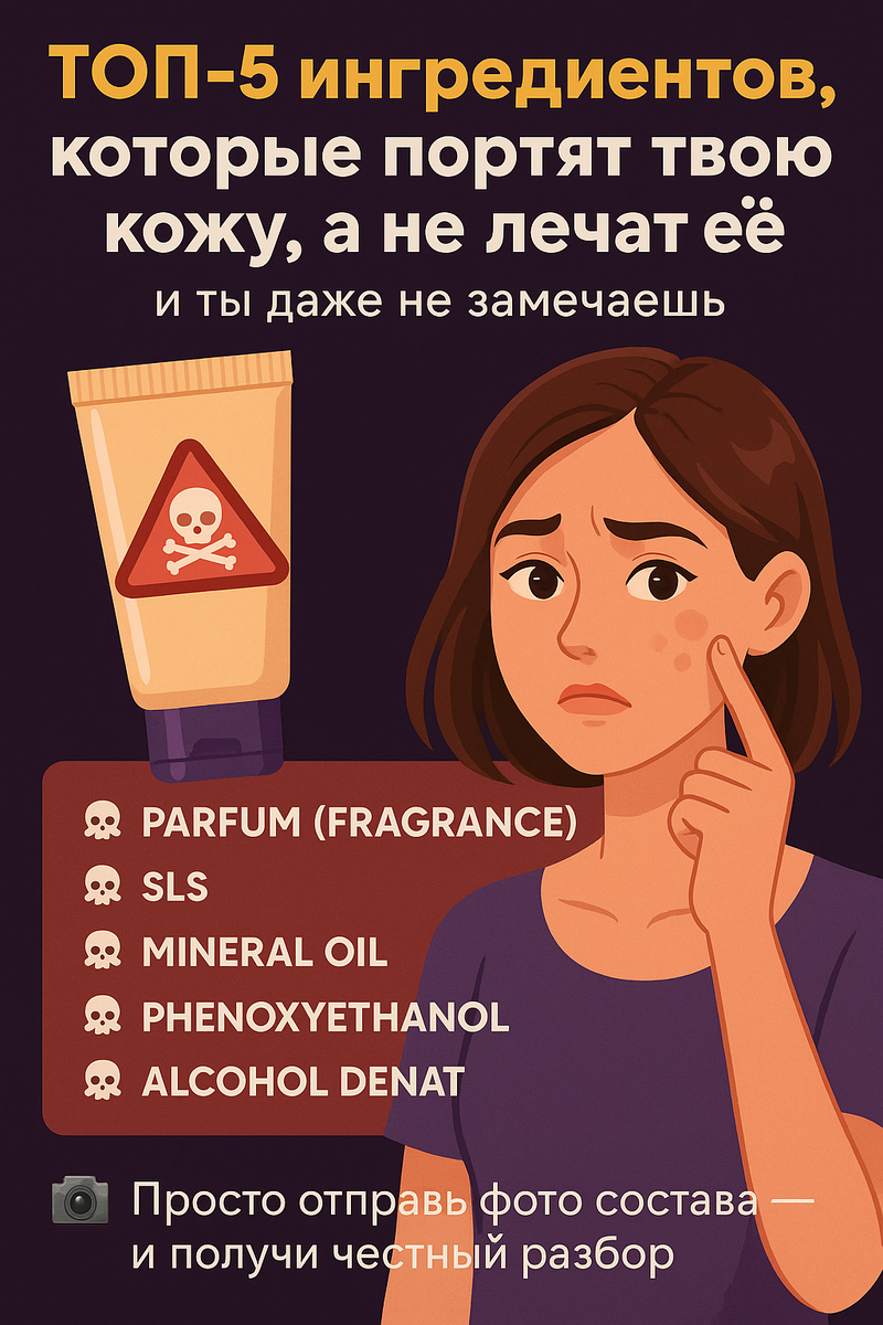 Ты веришь упаковке: «антивозрастной», «увлажняющий», «гипоаллергенно»… Но если твоя кожа вдруг становится тусклой, появляются высыпания, сухость или жирный блеск — это не «гормоны» и не «весна». Это может быть состав косметики. Вот 5 ингредиентов, которые могут вредить коже, даже если стоят на полке самого популярного бренда. И да — я нашёл их в своей косметичке, когда протестировал её с помощью бота. Кажется, что приятно пахнет = хорошо.