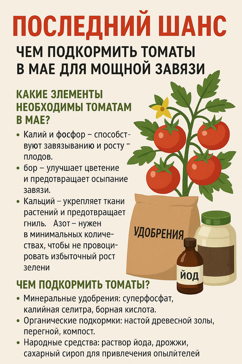 Если вы ещё не подкармливали томаты в мае — сделайте это в ближайшие дни. Одна грамотная подкормка может существенно повлиять на урожай. А регулярное внимание к растениям — залог крепких кустов и сочных плодов уже в июле.