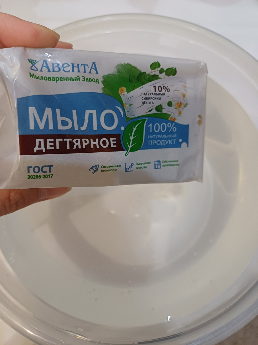 Всем привет! Сегодня решила побаловаться новым для меня мылом: Дегтярное мыло от ООО "АВЕНТА"! Мыло имеет хороший приятный запах дёгтя. И нетипичный цвет: Имеет штампы с обоих сторон. Полностью внешне похоже на хозяйственное мыло, но запах не дает ошибиться и спутать) Хотя, как видите, даже на штампе с обратной стороны мы видим "хоз.мыло" Замочила брусок) Красиво лежит, однако))) Снизу ссылка на видео "жмяка" размоченного кусочка!