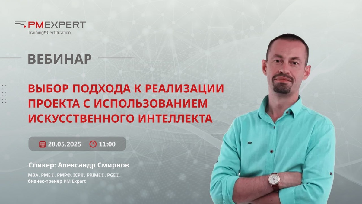 🔥 Вебинар: Выбор подхода к реализации проекта с использованием искусственного интеллекта 28 мая в 11:00 (мск) приглашаем вас на вебинар от компании PM Expert О чём пойдёт речь? ✅ Какие факторы влияют на выбор подхода к реализации проекта; ✅ Как применять генеративный ИИ для определения оптимального подхода; ✅ Практические примеры использования ИИ на реальных проектах. Подробнее о вебинаре Спикер: Александр Смирнов -- эксперт с 20+ лет опыта в управлении проектами. MBA, PME®, PMP®, ICP®, PRIME, PGE, прошел обучение в Гарвардском университете по направлению "менеджмент". 📌 Регистрация на вебинар #УправлениеПроектами #ИскусственныйИнтеллект #ИИвПроектах #PMExpert #Обучение #Вебинар