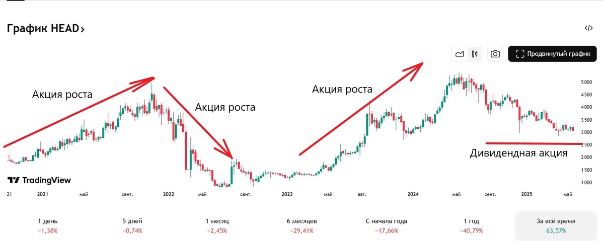 Скорее всего, далее акция так и останется дивидендной, и больше не будет акцией роста, что, например, меня устраивает больше. В нынешней ситуации считаю, что это лучше, потому что сильного роста рынка не предвижу, а его сильное падение более вероятно. Это значит, что оставаясь акцией роста, Хэдхантер валился бы вместе с рынком, обгоняя его в падении. Но потенциальные высокие дивиденды теперь будут удерживать его от такого падения и защищать портфель от сильных просадок.