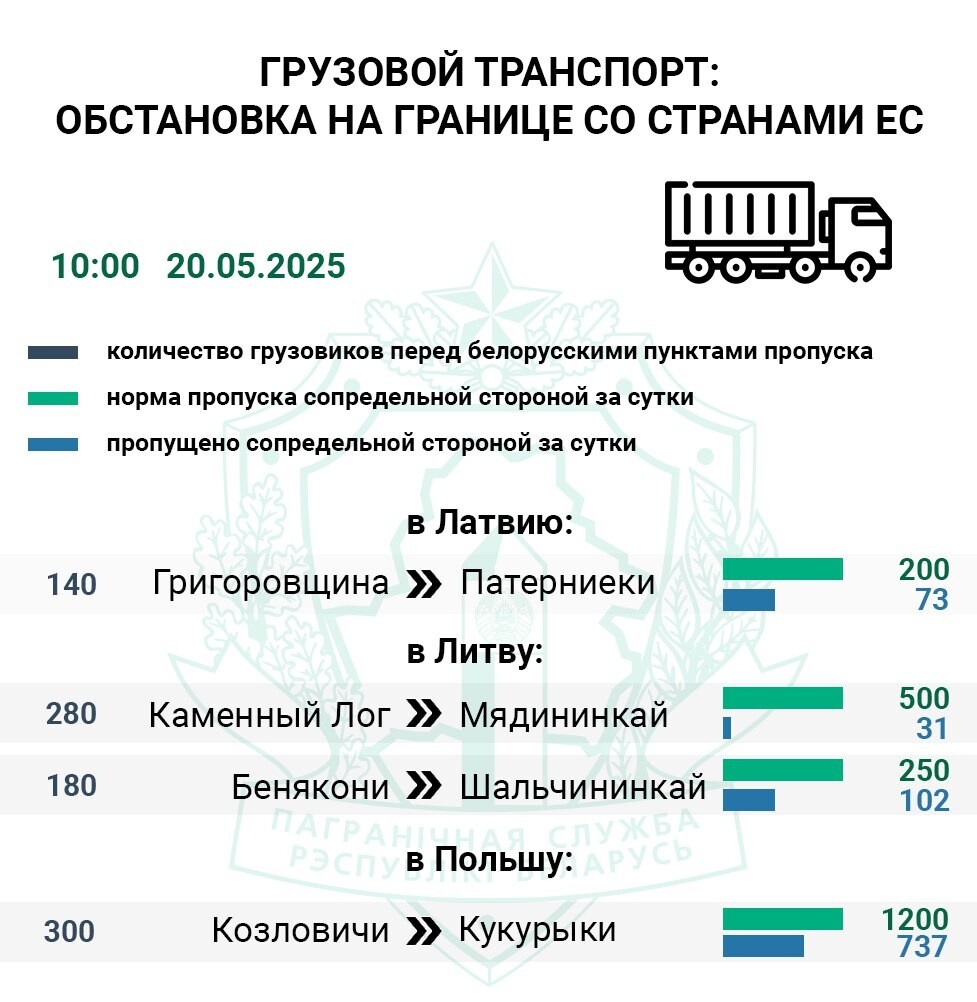 За сутки очередь грузовых авто на въезд в Польшу увеличилась в два раза, сообщают в Госпогранкомитете Беларуси. Наблюдается и большое скопление легковых машин на границе. Инфографика здесь и далее: t.me/gpkgovby По состоянию на 10:00 20 мая перед польским пунктом пропуска «Кукурыки» («Козловичи») фиксируется 300 большегрузов. Данный маршрут — самый загруженный для фур на пути в ЕС. За сутки очередь выросла на 150 единиц. Сопредельная сторона за 24 часа приняла на свою территорию 61% авто от нормы. Контрольные службы погранпереходов «Мядининкай» («Каменный Лог») и «Шальчининкай» («Бенякони») оформили всего 23% транспорта. Въезда в Литву ожидают 460 грузовых авто. Перед латвийским КПП «Патерниеки» («Григоровщина») находятся 140 фур. Сопредельная сторона приняла на свою территорию 36% грузовиков от нормы. Около 1 090 легковушек ожидают въезда в Польшу перед пунктом пропуска «Тересполь» («Брест»). Его контрольные службы за 24 часа выполнили норму пропуска на 38%. Кроме того, 30 легковых ма