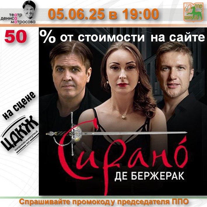 🎭 Партнёр Программы лояльности МФП — Театр Дениса Матросова, молодой, но уже полюбившийся зрителям независимый театр, приглашает участников Программы на спектакль: 📌 «Сирано де Бержерак» 🗓 5 июня в 19:00 📍 ЦДКЖ ✨ Актёрский состав: Денис Матросов Марина Коцько-Баканова Анатолий Руденко 🎟 Скидка 50% по промокоду: спрашивайте у председателя ППО #МойТеатральныйМарафон