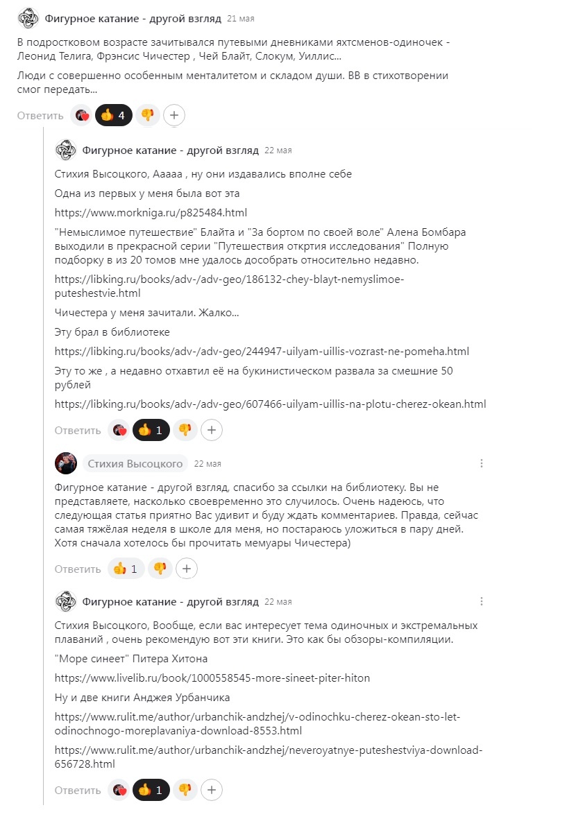 Наверное, до таких крайностей при встрече всё же не доходило, ведь одиночные плавания через океан начались не вчера. С первого такого путешествия в 1876 году до 70-х годов ХХ века с разной степенью успешности мореплавали в одиночку человек двести. Собрал эти истории вместе Анджей Урбанчик в своей книге "В одиночку через океан. Сто лет одиночного мореплавания". Она издавалась в СССР в 1974 году. Не знаю, слышал ли о ней Владимир Высоцкий. А вот книгу М. Туровской "Герои «безгеройного времени»" он точно не только видел, но и читал. Она была в его личной библиотеке с дарственной надписью автора. Спасибо за наводку Андрею Скобелеву: "О Т. Хейердале и А. Бомбаре, об их плаваниях подробно говорится в первой главе книги" ("Из материалов к комментированию текстов В.С. Высоцкого. Песни, созданные для фильма "Ветер "Надежды"" // В поисках Высоцкого. 2022. № 47 (октябрь 2022). С. 50.). Конечно, я открыла эту главу и... не нашла там источника вдохновения для Высоцкого. Вопреки утверждению уважаемого филолога, в тексте почти ничего не рассказывается о путешествиях Т. Хейердала или А. Бомбара. Да и автор книги не очень-то лестно о них отзывается: