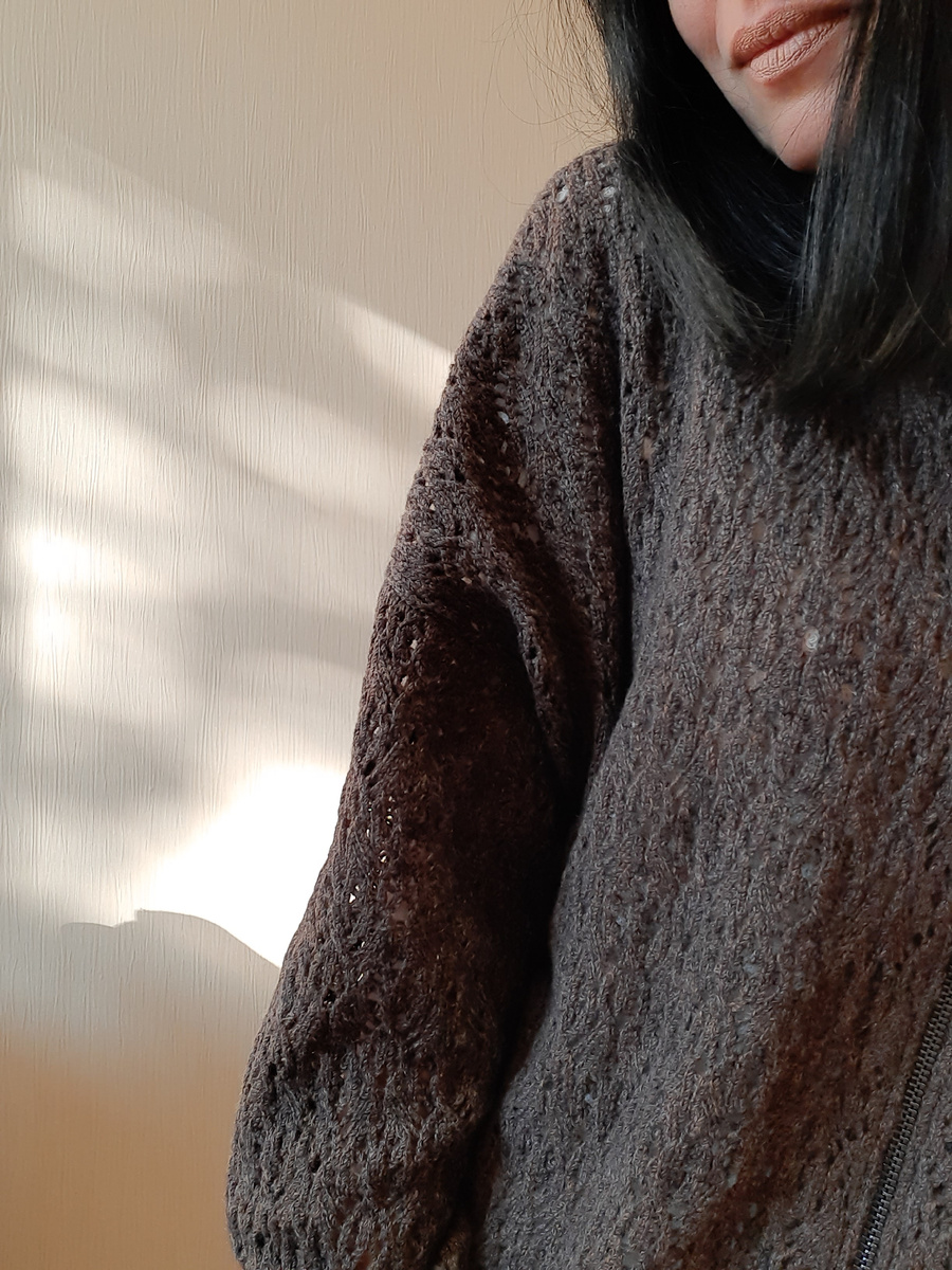 Друзья, всем привет! Ооо, добралась я до этой прелести! Нелегко дался мне этот бомбер, Ручная деккеровка! Кто знает тот поймёт!!! Требует предельного внимания! Манипуляции в каждом ряду, а пряжа ни разу не толстая... 550м/100гр, но состав изумительный 50% кашемир, 50% меринос, нежнятинка! Конечно в светлом цвете узор было бы видно гораздо лучше, но клиент захотела этот. Как бы себе такой связать... но я выберу все же пряжу по-толще! Вспоминаю сколько было пряжи.... Вроде немного меньше 400гр.. ушло все, переживала что не хватит, т.к размер не маленький и петель на всю фонтуру... Ширина 62см, длина 73см. Молнию вшивала на швейной машине. Какой же он получился шикарный! Очень приятный тактильно, даже самая чувствительная кожа будет нежно укутана и не почувствует дискомфорта! Наверное на этом все, что я хотела сказать! До новых встреч! Пока!