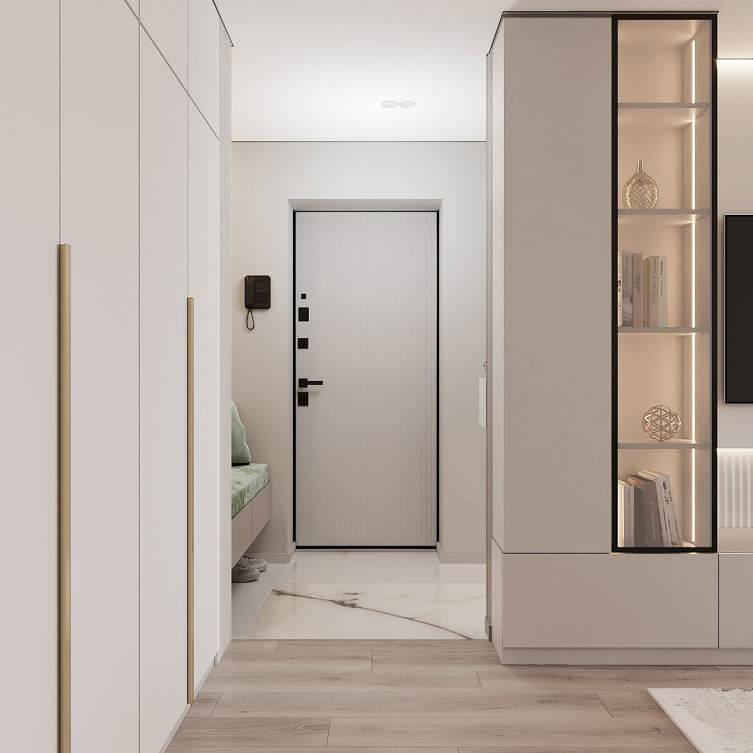 У семьи очень целостное было понимание от того, каким они хотят видеть свой будущий интерьер: нежные оттенки жемчужного, белого, и мы добавили немного цвета. В гостиной будет стоять диван красивого оттенка лесного мха, такого же оттенка стулья в столовой зоне и банкетка в прихожей.