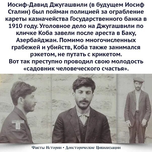 Мало кто знает, что всем известный лидер советского народа был настоящим бандитом. Он являлся главой огромной преступной группировки, грабил банки, занимался рэкетом, вытеснял с криминальной арены другие бандитские организации. Даже братья Нобели, один из которых стал учредителем Нобелевской премии, также оказались жертвами рэкета Иосифа Сталина, заплатив последнему 50 тысяч рублей. Разумеется, бандитом Сталин оказался не просто так. Это было партийное задание данное лично Лениным. Ленин придумал этой деятельности изысканое революционное обоснование, назвав его «экспроприацией». Для революции нужны были деньги, Сталину было поручено их найти. Собралась целая команда из отъявленых головорезов. Такие личности как Ахмед «медвежатник», Камо «террорист» убивали и грабили, а впоследствии заняли руководящии должности в новом советском государстве. Налет на пароход «Кавказ и Меркурий» Это одно из самых известных преступлений. Пароход перевозил деньги государственного банка. Бандиты переодевш