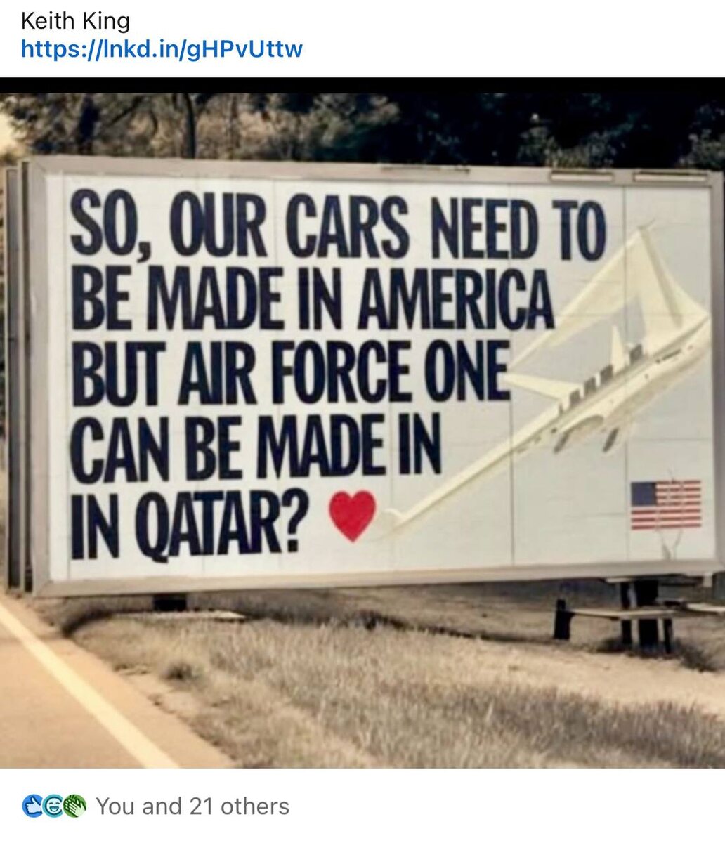 Ну тупые! Печали пост… Вот такой демотиватор распространяется сейчас по запрещенным в России американским соцсетям. Там написано: «Итак, наши автомобили должны быть произведены в Америке, но борт N1 в Катаре». Это все они про то, что Дональд Трамп готов согласиться на подарок от Катара. И главное - публика верит, что этот самолет произведен в Катаре 🙈. Там смайлики и аплодисменты. Это Boeing, дебилы бл… (с) Он был произведен на заводе Boeing в Америке, и американский авиапром его укомплектовывал. Если вы ещё сомневались, что идет отупение американской нации - вот вам очередное доказательство.