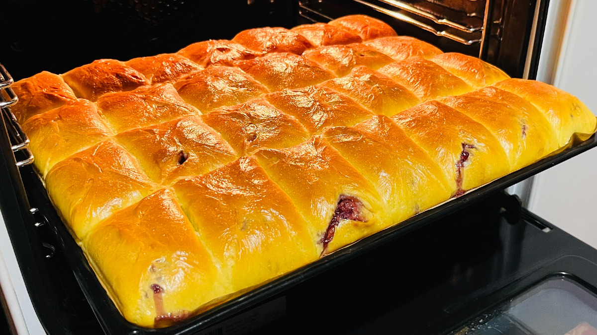 - Немного раскатать тесто, положить джем и сформировать в четырехугольник