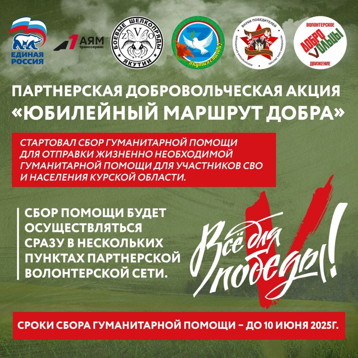 На информационных ресурсах Партии сообщали, что Якутское региональное отделение присоединились к партнерской добровольческой Акции «Юбилейный маршрут добра». Сбор гуманитарной помощи для заполнения трех 40-тонных контейнера для отправки жизненно необходимой гуманитарной помощи для участников СВО и населения Курской области стартовал. Сбор помощи будет осуществляться в местных отделениях Партии, точками сбора определены Приемные Партии «ЕДИНАЯ РОССИЯ», а также сразу в нескольких пунктах партнерской волонтерской сети. Публикуем список пунктов приема гуманитарной помощи в волонтерских центрах и добровольческих организациях Якутии: «Якутия с тобой» по адресу: улица Бестужева-Марлинского, дом 5/1 контактный телефон: +7-924-597-19-65 «ДоброVольцы» по адресу: улица Короленко, дом 6 контактный телефон: +7-914-274-88-00 «Внуки победителей» по адресу: улица Дзержинского, дом 13, ДДН им.А.Е.Кулаковского, контактный телефон: +7-914-225-27-36 «Боевые шелкопряды Якутии» по адресу: улица Дзержи
