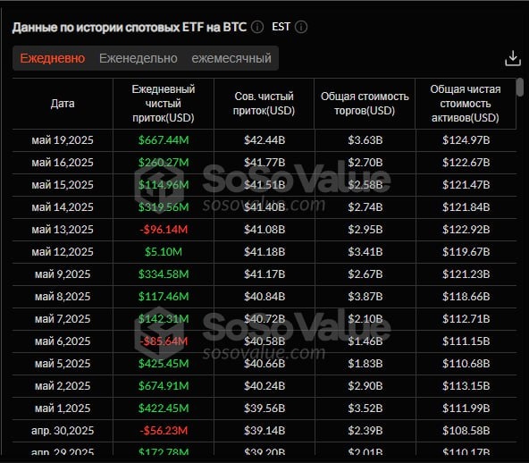 🔸19 мая спотовые биткоин-ETF зафиксировали общий чистый приток в размере $667 млн, что стало четвертым днем подряд чистого притока