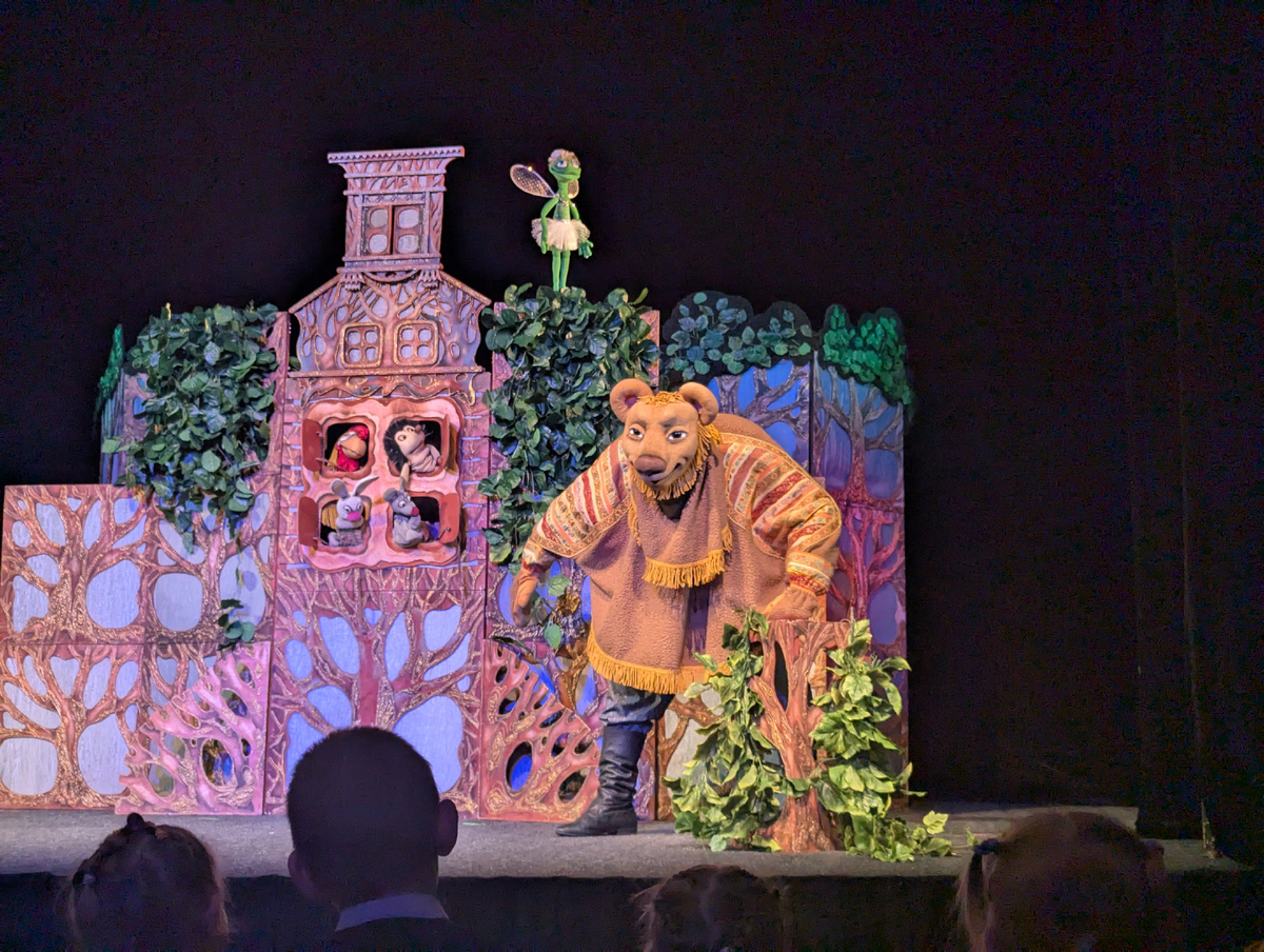 Леня правила принял, сидел тихо. Очень напрягся, когда выключили свет и прижался ко мне, но я была рядом, он успокоился. Потом со сцены прозвучали знакомые слова - заявлен был Терем-теремок, но стандартную народную сказку расширили, вплетя туда и сказку о глупом мышонке, и элементы авторского теремка михалкова. В общем, Леня следил за действием, и, мне кажется, вполне улавливал, что проиходит.