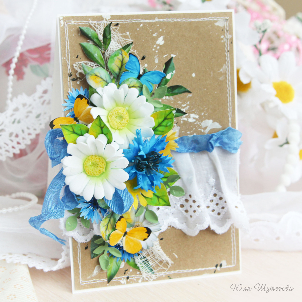 Продолжаю делиться с вами положительными эмоциями и вдохновением через свои работы. Сегодня покажу вам открытку с летним настроением. Основные цвета этой работы: светло-коричневый, синий, белый, а дополняют их черный, желтый и зеленый. Палитра получилась теплой и очень приятной. Я очень люблю работы с крафтовой бумагой или картоном. С ним удачно сочетаются почти все цвета (яркие и нежные). Открытка классической формы и стандартного размера (15х10см). Основа из плотного кардстока (200гр/м2) белого цвета. Подложка из крафтового кардстока. Нанесла на нее брызги белой и черной краски. А еще прошила подлодку белой ниточкой по краю. Строчки намеренно сделала неряшливыми. В качестве одного из декоративных элементов наклеила кусочек шитья и сверху добавила шебби-ленту василькового цвета. Для создания композиции выбрала цветы из фоамирана (василек и ромашки), авторские отрисовки листиков, бумажные вырубные веточки, бумажные высечки цветов, бабочек и листьев. Ромашки делала в смешанной технике.