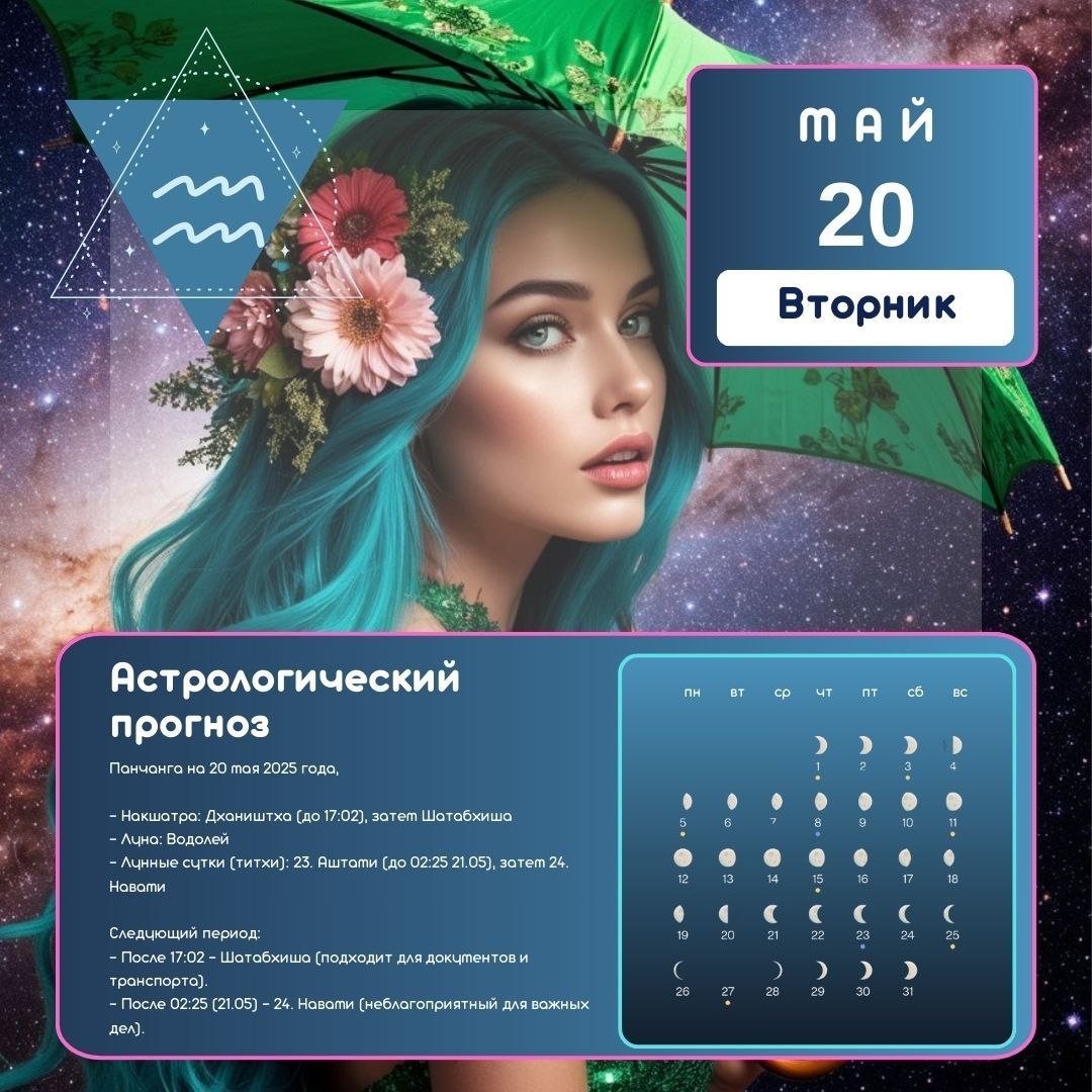 Астрологический прогноз на вторник, день Марса Луна в Водолее | 23-и лунные сутки (до 14:58) Сиддха йога (благоприятная для завершения дел и духовных практик) Ключевые аспекты дня: Энергия Марса усиливает активность, решительность, но требует контроля над гневом. Луна в Водолее активирует коллективные проекты, инновации, но может вызывать эмоциональную отстраненность. Смена накшатр в 17:02 (Дхаништха → Шатабхишадж) и каран (Балава → Каулава в 14:58) меняет фокус энергий. Рекомендации по времени: До 14:58 (Балава карана + Дхаништха накшатра): Благоприятно: Групповые мероприятия: концерты, церемонии, командная работа. Творчество: музыка, танцы, арт-проекты. Активные действия: спорт, путешествия, начало лечения. Покупка новой одежды или освоение технологий. Избегать: Рутины, уборки, сексуальной активности. Важно: используйте Брахма-Мухурту (02:31–03:19) для медитации и планирования дня. После 14:58 (Каулава карана + Шатабхишадж накшатра после 17:02): Благоприятно: Заключение сд