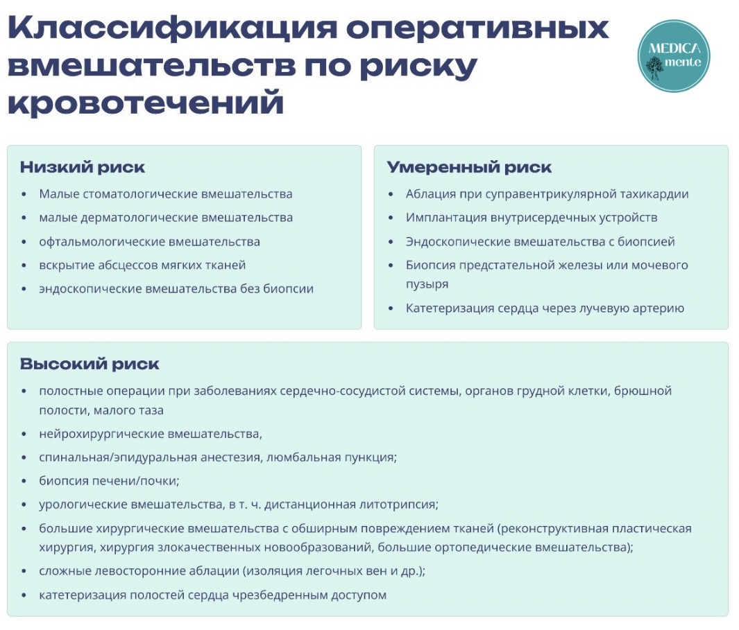Важно понимать: не все вмешательства требуют отмены кроворазжижающих препаратов. Всё зависит от риска кровотечения. Операции делят на три уровня: