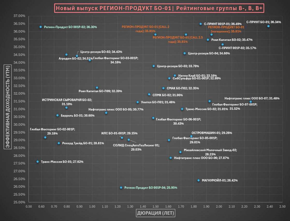 📥 Утра вам прекрасного, друзья! Наконец-то возвращаемся к ежедневным постам о новинках - до конца месяца расписаны практически все дни :) А значит, будет над чем поразмышлять! ✅ Первичка до обеда и начало торгов в 16:30 по Москве сегодня у единственного эмитента: 〰️〰️〰️〰️〰️〰️〰️〰️〰️〰️ 🔴 РЕГИОН - ПРОДУКТ БО-01 👨🏫 Только для квалов 📊 🅱️➖ ➖ https://raexpert.ru/releases/2025/may06a (06.05.2025) 🔹 ISIN: $RU000A10BLP1 ▪️ Купон фиксированный: 31% ▪️ CALL через 2 и 2,5 года торгов ▪️ До погашения 3 года ➤ Крайне небольшой выпуск от производителя снековой продукции из Пензенской области, брендами которой являются «ХРУСТ», «ХРУСТ BOX», «ХРУСТЕЦ». Помимо "эксклюзивного" рейтинга на выпуск еще и навешена необходимость квальства, так что стоит быть хорошенько уверенным в эмитенте и обладать сим статусом, дабы посетить выпуск. Рейтинг 🅱️➖ у компании стабильно действует с 2022 года, но я бы не сказал, что рейтинговое агентство тут абсолютно справедливо - хочется уже, чтобы качели выбрали напр