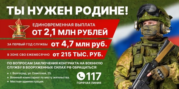 В Волгоградской области продолжается набор на военную службу по контракту. Жители Волгоградской области, заключившие контракт с Минобороны и отправившиеся в зону СВО, получат суммарную единовременную выплату от 2,1 млн рублей — дополнительная материальная помощь предоставляется из средств федерального и регионального бюджетов, муниципальных, внебюджетных источников, средств работодателей. Меры поддержки начнут поступать на счет заявителя уже на следующий день после подписания контракта и составления заявления в пункте в пункте отбора. Встань в один строй со СВОими🇷🇺 #ZаНаших #Zащита #ПобедаZаНами #администрацияУрюпинска