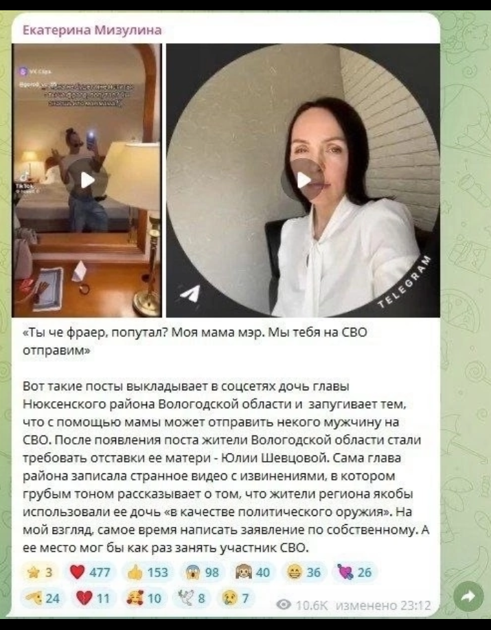Так выступила дочка чиновницы из Вологодской области. Она плясала в Тик-токе дикие танцы , диким текстом. Вышел весьма скандальный пост. С чудесной репликой: Ты че, фраер, попутал? Ты знаешь, кто моя мама? Мэр. Мы тебя на СВО отправим". Естественно, поднялся шум и скандал вышел на просторы. Фраза про " извинения грубым тоном" вызвала у меня недоумение. Она басила? Или покрикивала? Пошла посмотрела. Да там мяу-мяу. А потом вся сущность вылезла. Очень неприятная дама и жёсткая. Видео извинения тут То, что маман решила о сделанной провокации против нее лично, возможно и так. Давно ждали повод, чтобы убрать. Такие обычно гвоздями к креслу прибиты. Но так родная доченька постаралась. Или ее заставили? Естественно, дети в 19 лет уже делают, что хотят и сложно на них влиять. Особенно на расстоянии. Губернатор мимо не прошёл и тут же маму уволил. За неподобающее воспитание дочери. Филимонов осудил ее "выступление" Дочь Ю. П. Шевцовой живёт и учится вдалеке от мамы, будучи предост