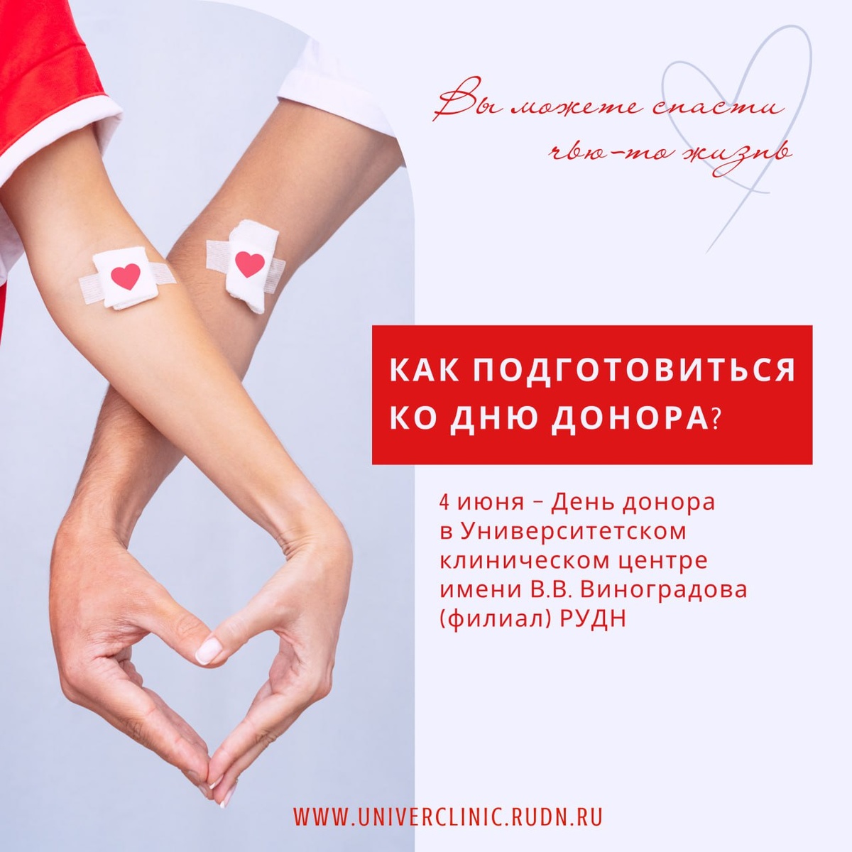 Как подготовиться ко Дню донора? 4 июня состоится традиционный День донора в Университетском клиническом центре им. В.В. Виноградова (филиал) РУДН, который мы проводим вместе с Центром крови им. О.К. Гаврилова. Приглашаем желающих сдать кровь, которая для кого-то окажется спасением в самый критический момент. Заранее сообщаем о такой возможности, ведь к этому событию нужно подготовиться, чтобы остаться здоровым и не потерять желание вернуться в следующий раз совершить доброе дело. Кто может стать донором? Совершеннолетний человек без хронических, инфекционных заболеваний и острого периода аллергической реакции. В число ограничений на донацию входят такие пункты: 🟣Беременность 🟣Наличие алкоголя в крови (ограничения для сдачи от 2 дней) 🟣Перенесённый грипп, ОРВИ (ограничения для сдачи до 30 дней) 🟣Инфекционные заболевания (ограничения до 3 месяцев) 🟣Острый период аллергии (ограничение до 2 месяцев) 🟣Прием лекарств (ограничения от 3 дней до 2 недель) 🟣Вакцинация (необходимо п