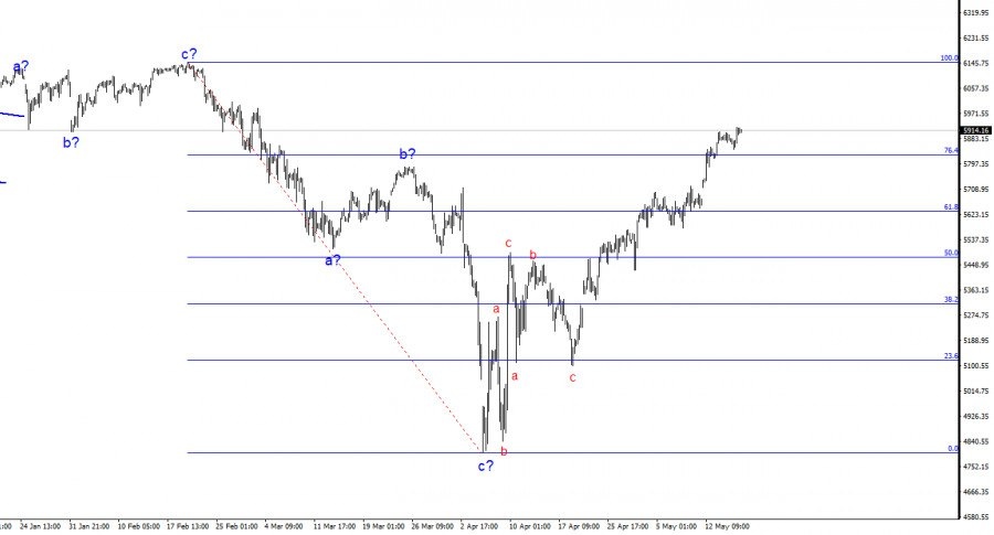 Волновая разметка 24-часового графика для инструмента #SPX выглядит в целом понятно. Глобальная пятиволновая структура даже в окно терминала на минимальном масштабе не умещается, так долго растут фондовые индексы США. В данное время предположительно завершено построение повышательного участка тренда. На мой взгляд, мы еще долгое время будем наблюдать продолжение коррекционной серии волн, так как текущий коррекционный участок тренда выглядит не слишком убедительно. Я бы предпочел увидеть более ярко выраженную трех или пятиволновую структуру.