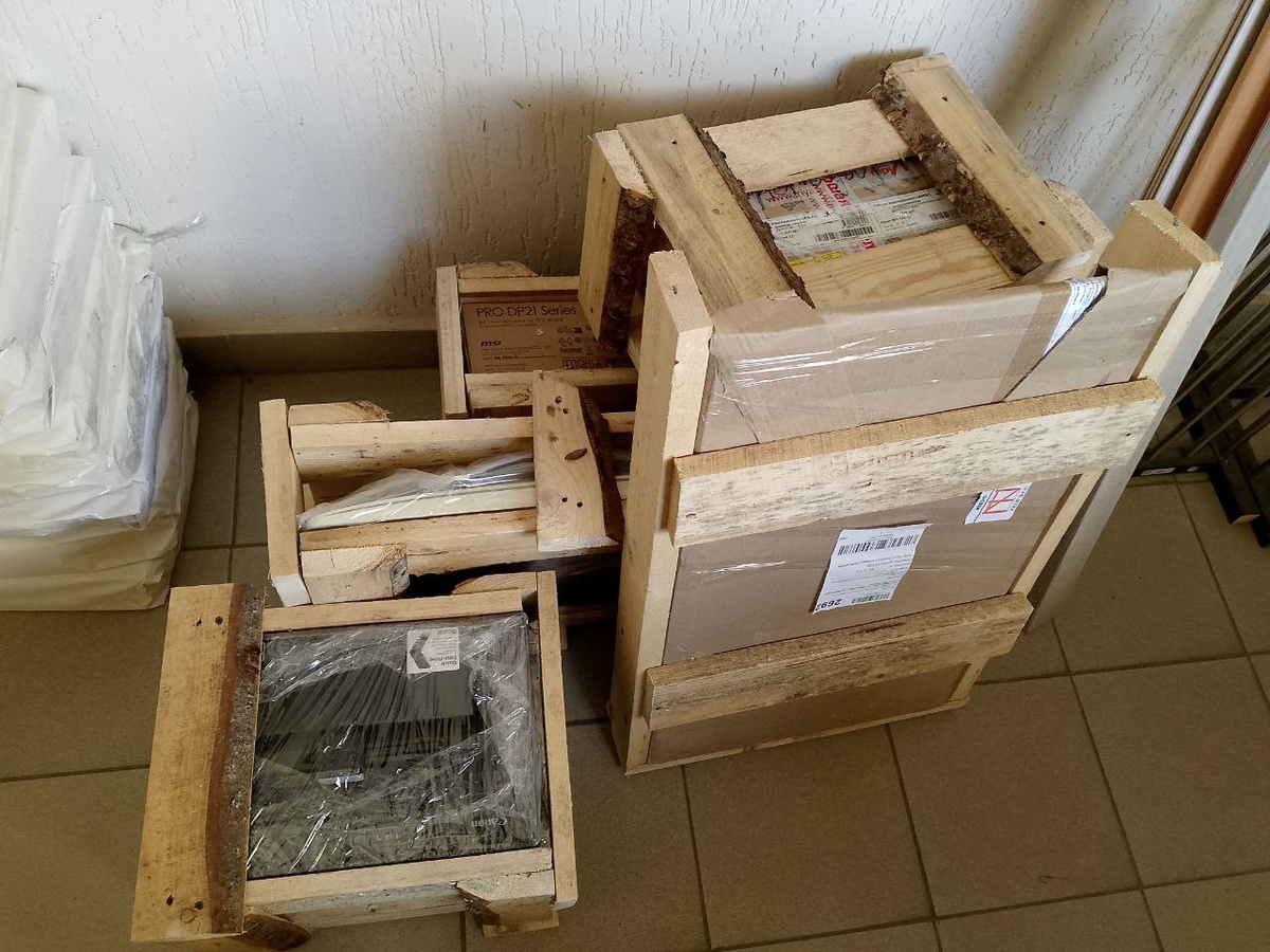Вот как нужно технику транспортировать. Видимо, из какого-то магазина нашей сети прислали. Возможно, на списание, так как один монитор, судя по толщине корпуса, далеко не "свежий". Также в куче лежит ещё один монитор, два небольших системных блока (неттопы?) и принтер