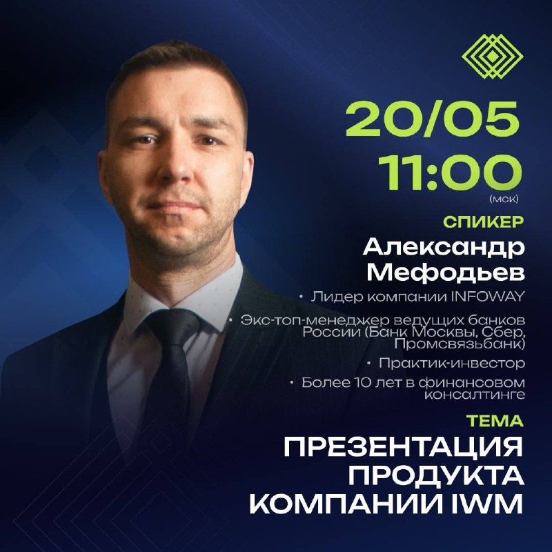 ‼️👀ЖДЁМ ВАС НА ПРЕЗЕНТАЦИЮ INFOWAYMARKETING CO.L.L.C. (IWM) — 20 МАЯ! 11:00! 🎤 Спикер: Александр Мефодьев ЛИДЕР КОМПАНИИ INFOWAY Экс-топ-менеджер федеральных банков, предприниматель, инвестор, трейдер. 🔗 Ссылка на встречу: https://us06web.zoom.us/j/2116731674?pwd=xahqmhZLmGsNMAcfVYG8sNdiNWlLRY.1