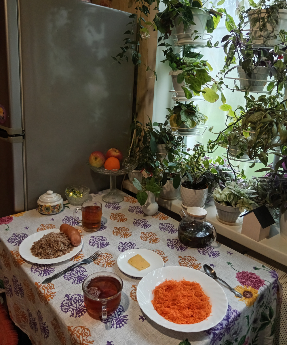 На завтрак себе приготовила салат из тёртой моркови с сахаром. Отрезала маленький кусочек сыра. Хватит мне. Особенно есть по утрам не хочу, но завтракаю обязательно. Сытный завтрак - залог продуктивного дня.
