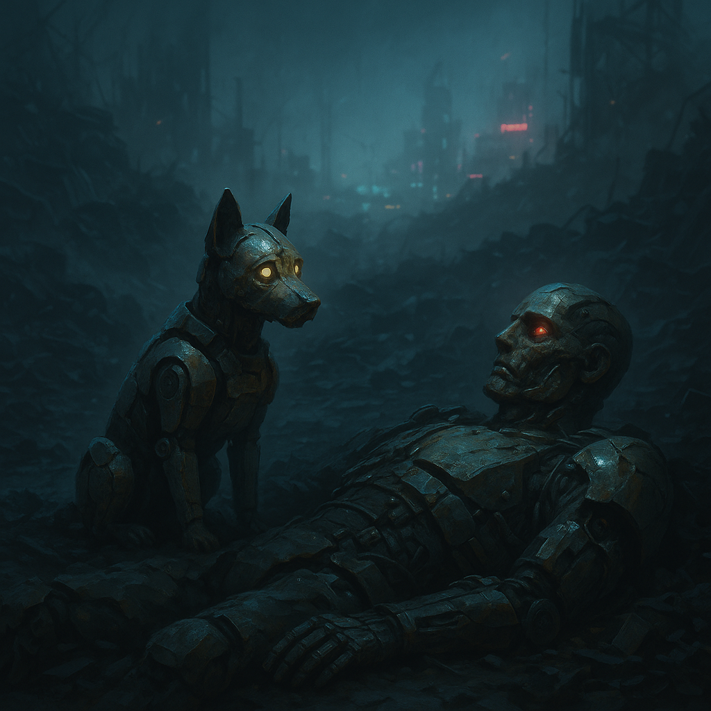 Тяжёлые шаги, скрежет металла. Из-за кучи сгоревших дронов появился силуэт — высокий, угловатый, будто собранный из запчастей разных эпох. Это был киборг. Полчеловека, полужелезо, с одним красным глазом и протезом вместо руки. Он посмотрел на собачку.