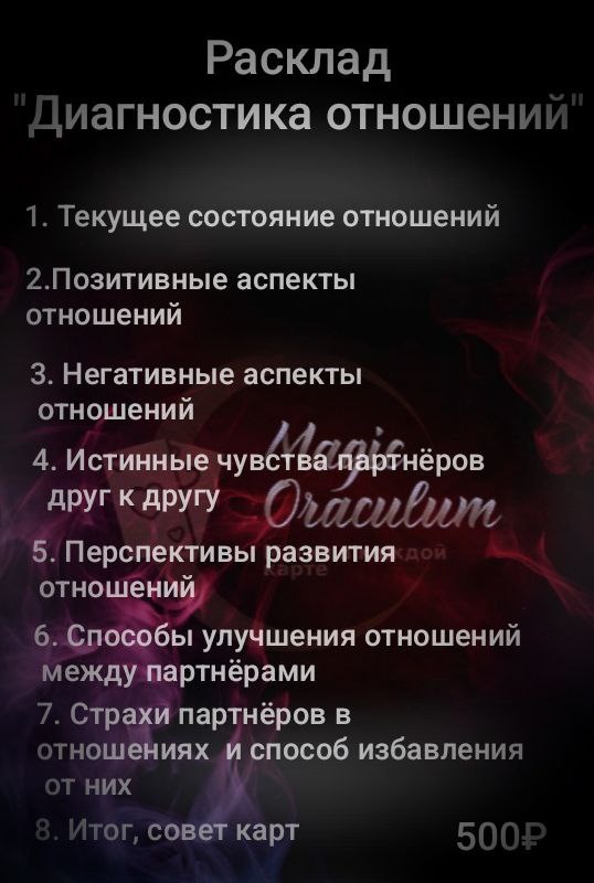Карты Таро могут помочь в диагностике отношений, поскольку они предоставляют информацию о динамике отношений между двумя людьми. Карты могут показать, какие проблемы существуют в отношениях, какие ожидания и потребности у каждого из партнёров и как они могут быть удовлетворены. Они также могут помочь определить, какие изменения необходимы, чтобы улучшить отношения.