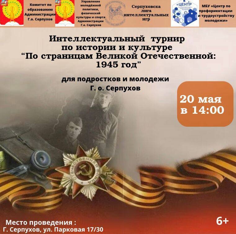 «По страницам Великой Отечественной: 1945 год» Сегодня, 20 мая, на базе Центра по профориентации и трудоустройству молодежи состоится интеллектуальный турнир по истории и культуре. Студенты и школьники проверят свои знания о событиях 1941-1945 года, отечественной культуре и мировой истории. Мероприятие состоится в 14:00 по адресу: г. Серпухов, ул. Парковая, 17/30.