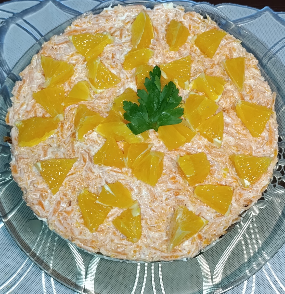 Апельсин очищаем, нарезаем кубиками и выкладываем сверху моркови. Желательно по максимуму удалить пленки.