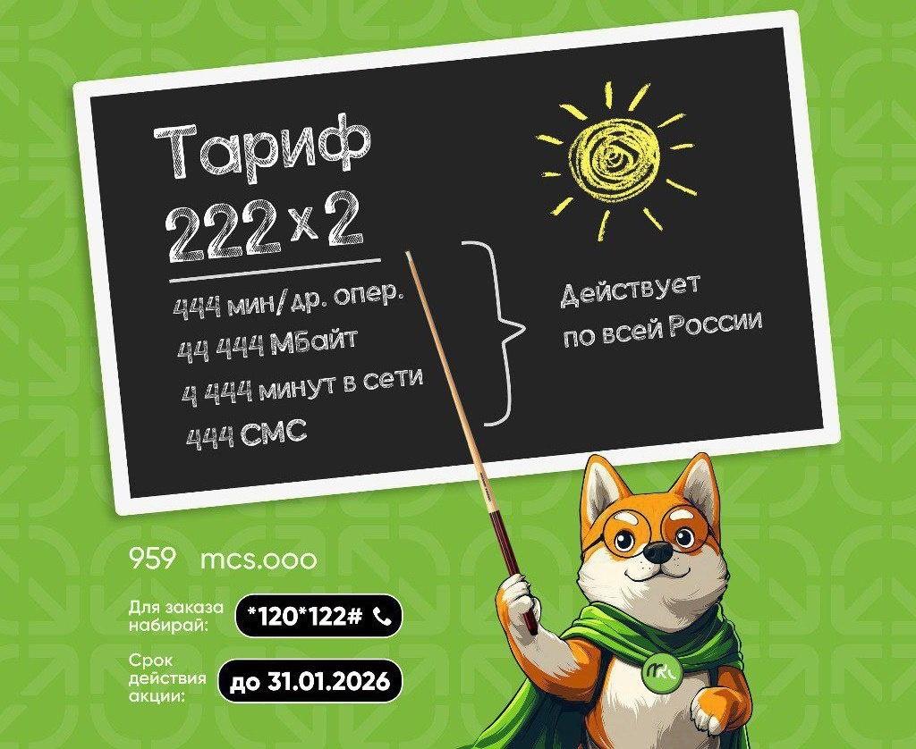 📲Оператор МКС представил новый тарифный план «222» До 31 января 2026 года — удвоенный пакет услуг за подключение. Больше минут для звонков по России за 222 рубля в месяц. 🔴4 444 минуты в пределах сети МКС. 🔴444 минуты для звонков на других операторов РФ. 🔴444 SMS. 🔴44 444 МБ мобильного интернета. 🖥 Подробности на сайте mcs.ooo