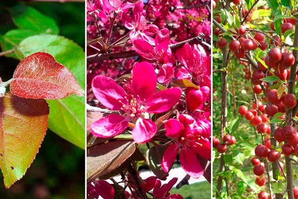 - в процессе селекции в яблони был внедрён природный пигмент антоциан, который придаёт всем частям дерева пурпурный отлив, особенно заметный во время цветения.