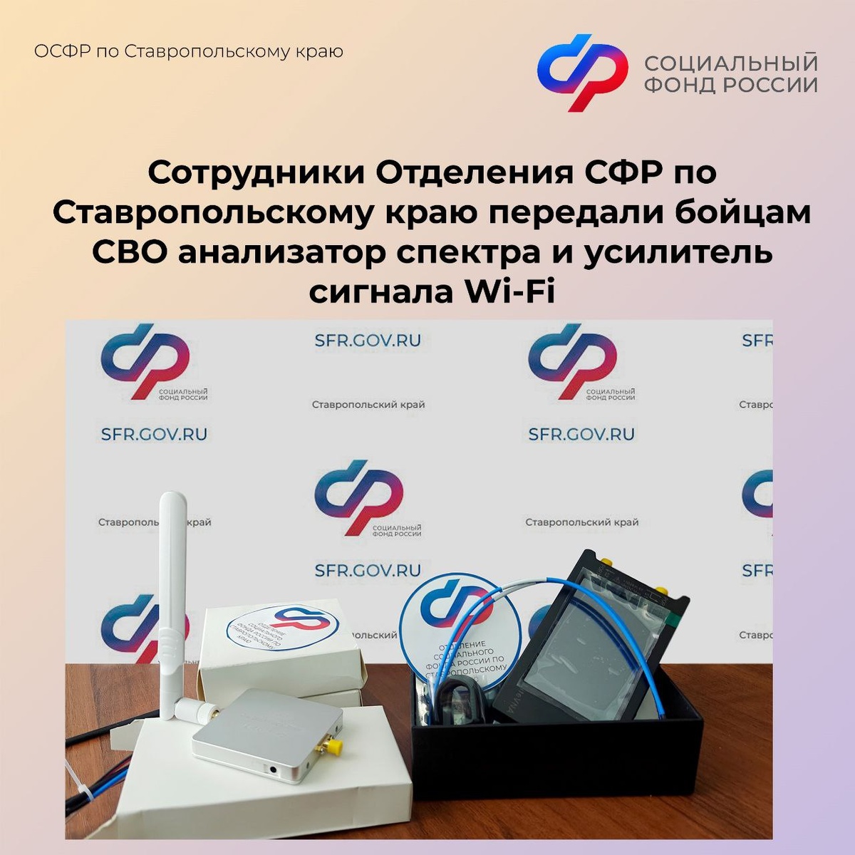 ❗️Сотрудники Отделения СФР по Ставропольскому краю поддерживают бойцов спецоперации. На этот раз они отправили на передовую анализатор спектра и усилитель сигнала Wi Fi. 📱С помощью этих приборов можно проверить стабильность радиосвязи, настроить параметры связи для конкретных условий, контролировать радиоэфир и определять присутствие БПЛА. 😘«Добровольческая помощь давно стала неотъемлемой частью жизни наших сотрудников. Поддерживая бойцов, мы выражаем благодарность за их службу, сохраняем веру в единство. Мы и в дальнейшем продолжим волонтерскую деятельность, чтобы поддержать ребят на передовой» - прокомментировала управляющий Отделением СФР по Ставропольскому краю Елена Долгова. #СФР #волонтерысфр