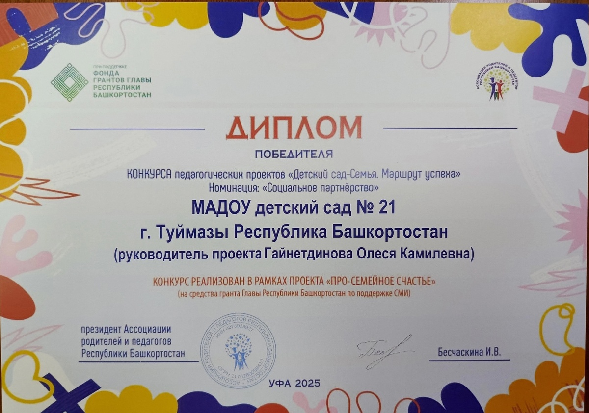 Воспитатель Олеся Гайнетдинова из детского сада № 21 города Туймазы стала победителем республиканского профессионального конкурса для педагогов «Детский сад-Семья. Маршрут успеха» в номинации «Социальное партнерство».
