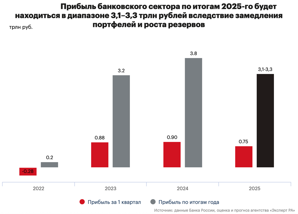 За первый квартал 2025 года банки заработали 744 млрд рублей и это на 17% меньше, чем год назад. По прогнозу Эксперт РА в годовом выражении прибыль сектора может сократиться до 3,1–3,3 трлн рублей (в 2024 было 3,8 трлн). Напомню, что прогноз от ЦБ пока более позитивный (3,0-3,5 трлн рублей), но и с более широким спредом😁 Причины ухудшения прогноза от Эксперт РА: Этот пункт, кстати можно оценить немного иначе - накопление капитального буфера это же прогнозируемое явление, которое обратно работает точно так же Что происходит по сегментам: