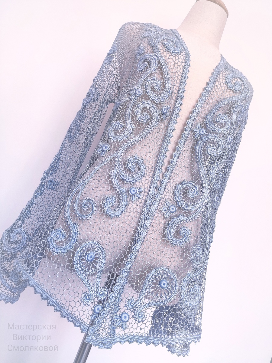 Жакет связан крючком из натурального шёлка. Листните галерею Пряжа Жакет связан из натурального шёлка двух близких оттенков цвета. Можно подобрать пару одинакового шёлка, с разными оттенками. Или пару матовый - глянцевый. Ориентир на рабочий метраж (Конечный метраж для вязания. Часто нить вяжем в несколько сложений. Например, нить метражом 3000м/100г смотаем для вязания в 5 слоёв. Рабочий метраж будет 600м/100г