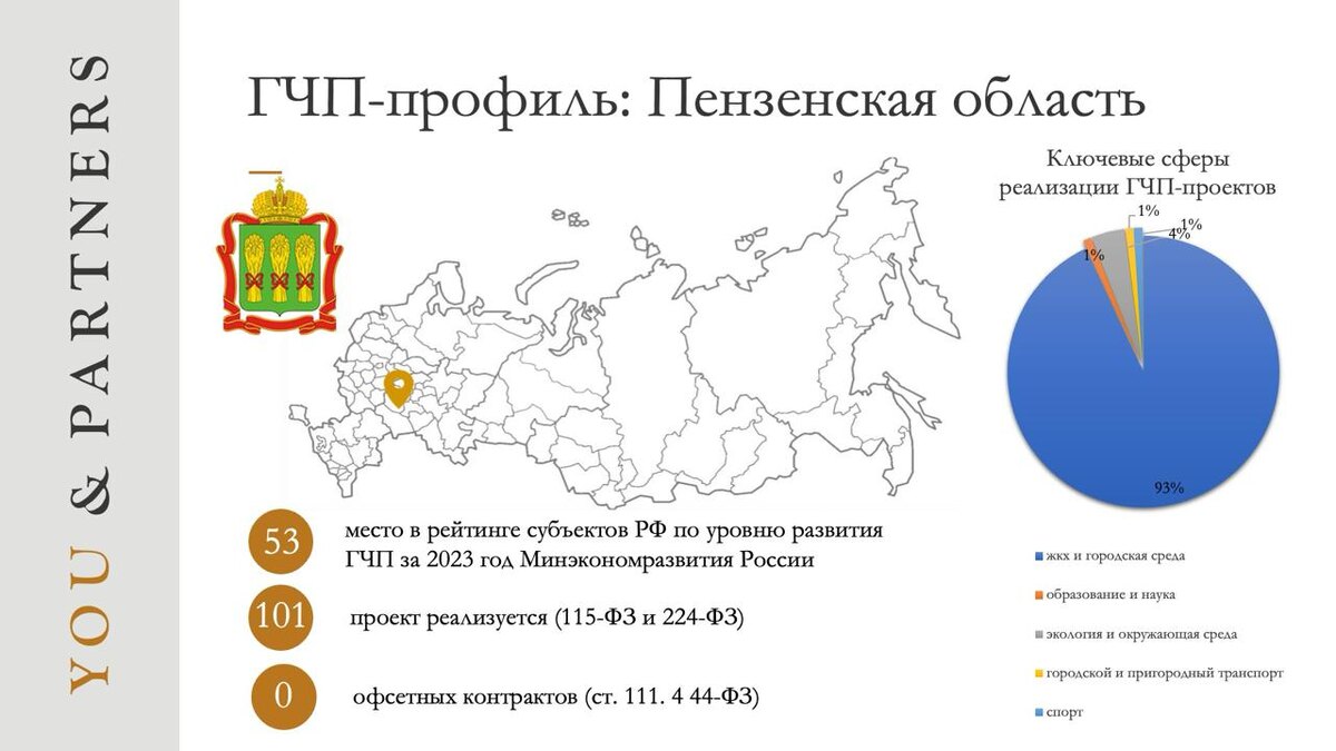 🏆 Место в рейтинге Согласно итоговой оценке рейтинга субъектов РФ по уровню развития ГЧП за 2023 год (Минэкономразвития России), Пензенская область занимает 53 место (поднявшись на 1 позицию по сравнению с 2022 годом). Наиболее интересные проекты, планируемые к реализации на территории Пензенской области: ⚙️ КС в отношении комплекса недвижимого имущества и сетей инженерно- технического обеспечения МАУЗ «Санаторий «Заречье». 🚛 Строительство транспортно-логистического комплекса. 🧮 Количество проектов По данным РОСИНФРА в регионе реализуется 101 ГЧП-проект (учтены проекты по 115-ФЗ и 224-ФЗ на стадиях от предынвестиционного этапа до завершения проекта). 🧩 Сферы реализации проектов: Проекты реализуются в следующих сферах: - городской и пригородный транспорт (1 проект); - жкх и городская среда (93 проекта); - образование и наука (1 проект); - спорт (1 проект); - экология и окружающая среда (4 проекта). Примеры проектов (по данным РОСИНФРА): 🚏 Концессионное соглашение в отношении компле