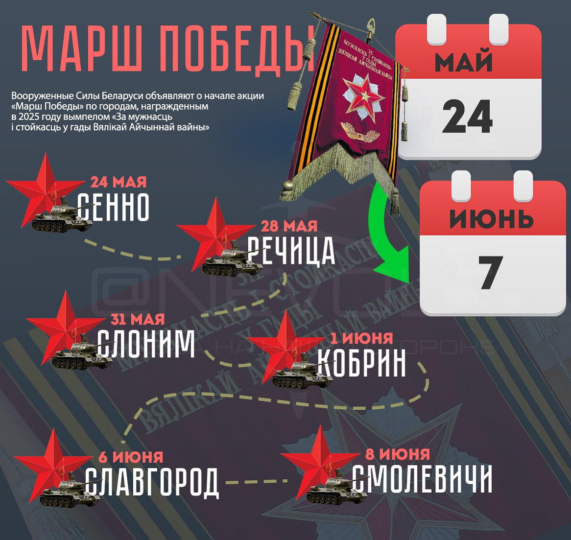 С 24 мая по 7 июня в шести городах Беларуси пройдет акция «Марш Победы», приуроченная к чествованию городов, удостоенных вымпела «За мужнасць і стойкасць у гады Вялікай Айчыннай вайны» в 2025 году. В Речицу гостей приглашают 28 мая. В программе праздника — выставка танков, участвовавших 9 мая в столичном параде, выступления военных оркестров, демонстрация стрелкового оружия, показательные выступления сил спецопераций, профориентация от военных учебных заведений. Цель акции — сохранить историческую память и воспитать уважение к подвигу нашего народа.