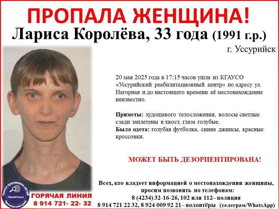 ВНИМАНИЕ! ПРОПАЛА ЖЕНЩИНА! Лариса Королёва, 33 года (1991 г.р.) г. Уссурийск 20 мая 2025 года в 17:15 часов ушла из КГАУСО «Уссурийский реабилитационный центр» по адресу ул. Нагорная и до настоящего времени её местонахождение неизвестно. Приметы: худощавого телосложения, волосы светлые сзади заплетены в хвост, глаза голубые. Была одета: голубая футболка, синие джинсы, красные кроссовки. МОЖЕТ БЫТЬ ДЕЗОРИЕНТИРОВАНА! Всех, кто владеет информацией о местонахождении женщины, просим позвонить по телефонам: 8 (4234) 32-16-26, 102 или 112– полиция 8 914 721 22 32, 8 924 009 92 21– волонтёры (телеграм/WhatsApp) #поиск_Королёва Барахолка: @uss_baraholka Подписка: @Mark2_chee