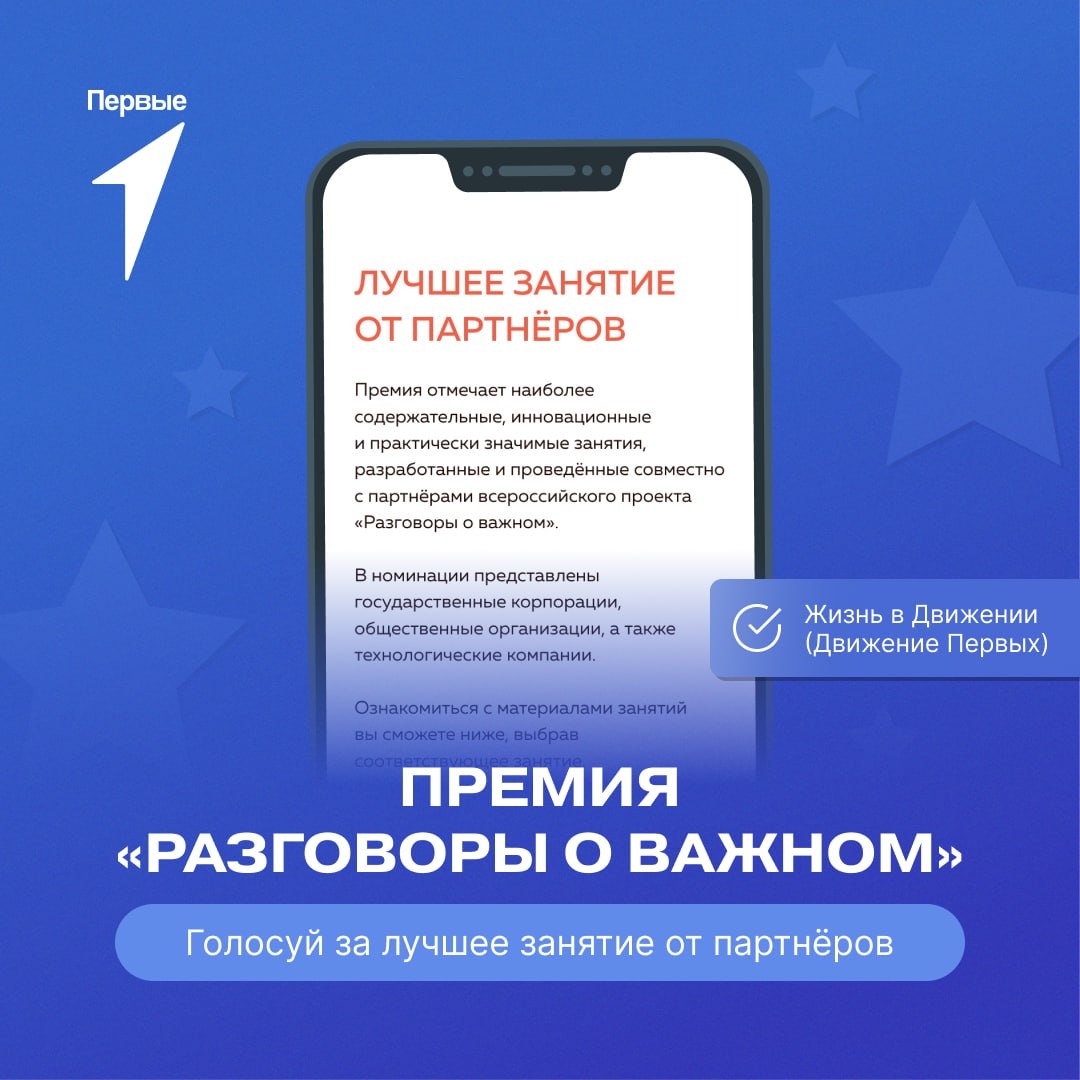 #ПоддержиПервых 👍 Голосуй за фильм «Жизнь в Движении» до 23 мая — по ссылке ⬅️ Осталось 3 дня, чтобы отдать свой голос за Движение Первых в номинации «Лучшее занятие от партнёров». Более 1,7 миллиона школьников, студентов, педагогов и родителей уже сделали свой выбор во Всероссийской премии «Разговоры о важном» — присоединяйся и ты!